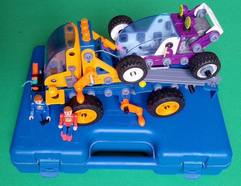 Con motor de fricción. Faltan algunas piezas secundarias, pero se pueden construir todos los modelos. Sin instrucciones en papel, pero mando un PDF con ellas. En su maletín original. Recogida zona metro Estrecho. Me pongo primero en contacto (por WhatsApp) con las personas que me dejan su número.